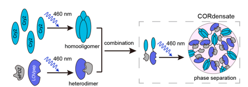 图2.CORdensate和optoDroplet具有不同的光控相分离动力学行为
