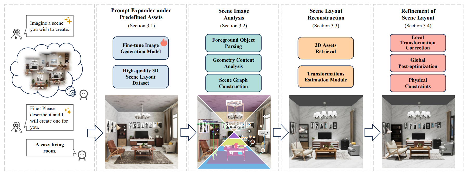 为此,清华大学深圳国际研究生院曾龙副教授课题组与合作者联合攻关,研究搭建一个3D场景布局系统(图2),能在给定某个高质量的3D资产库的情况下,在文本或图像输入下即可生成自然、细致且逻辑连贯的3D场景布局。