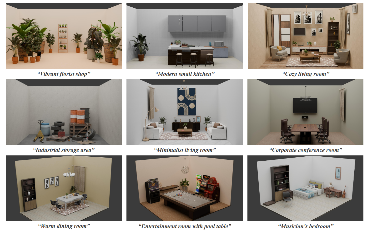 图1.文本-3D场景生成系统获得的高质量3D场景