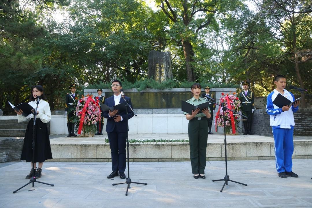 “我用残损的手掌,摸索这广大的土地。”在庄严的纪念碑前,日新书院2021级本科生王一竣,地球系统科学系2022级直博生郝琦,水利水电工程系2022级本科生、退伍军人李萧卉,清华附中2023级学生许浩诚带来主题诗朗诵《我用残损的手掌》,敬献先烈,遥寄追思。伴随着饱含深情的朗诵声,面对庄严的清华英烈碑,每个人的思绪都被拉回到那个战火纷飞的年代。寒夜里闪烁着辉光,绝望中孕育着希望,大好河山被血和泥侵蚀,但祖国辽远的一角依然完整,依然温暖、明朗、坚固而蓬勃生春。