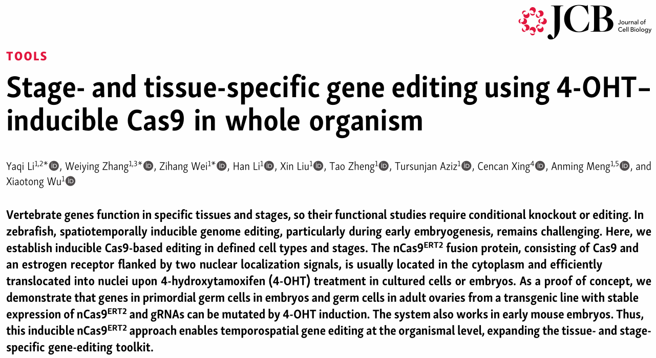 On January 2, Anming Meng's lab from the School of Life Sciences at Tsinghua University published a study titled "Stage- and tissue-specific gene editing using 4-OHT-inducible Cas9 in whole organism" in the Journal of Cell Biology. This study developed a germline-specific inducible genome editing system in zebrafish and demonstrated that with 4-OHT treatment, the target genes in the zebrafish germline could be specifically knocked out at different developmental stages, achieving stage- and tissue-specific dual regulation. Furthermore, this inducible Cas9 protein could also achieve conditional gene knockout in early mouse embryos, highlighting its potential as a tool for cross-species research.