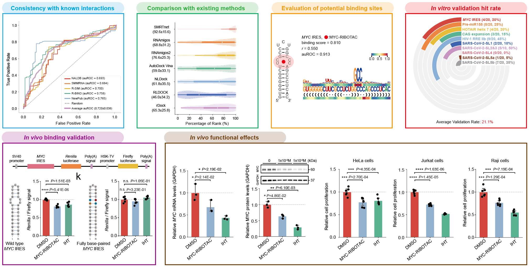 Using the cancer target MYC, which has long been considered “undruggable,” as a representative example, the research team redirected their focus to its RNA, MYC RNA, with particular emphasis on the internal ribosome entry site (IRES) element that is critical for regulating MYC expression. By integrating SMRTnet predictions with experimental validation, they identified multiple compounds capable of binding to the MYC IRES. Notably, one candidate compound markedly reduced MYC expression at both the transcriptional and translational levels and effectively inhibited cell proliferation while inducing apoptosis across three cancer cell lines, demonstrating promising antitumor activity.