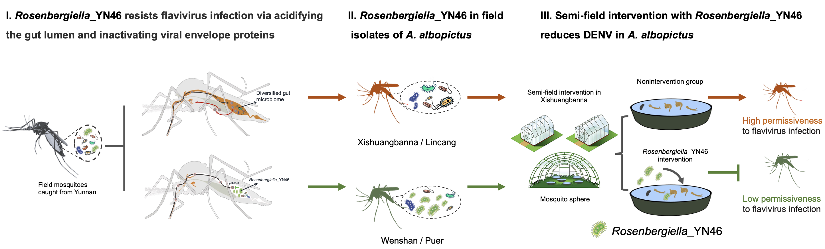 The naturally occurring symbiotic bacterium Rosenbergiella_YN46 inhibits dengue virus transmission by acidifying the mosquito gut during blood feeding. Designed by a team at Tsinghua University. Credit: Tsinghua University