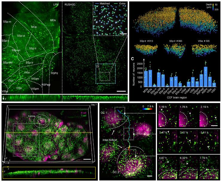 Mesoscale Intravital observations. (Top) Cortex-wide 3D neural recording in a behaving mouse. (Bottom) Long-term tracking of intercellular dynamics and B cell clustering within lymph node germinal centers. Credit: Tsinghua University
