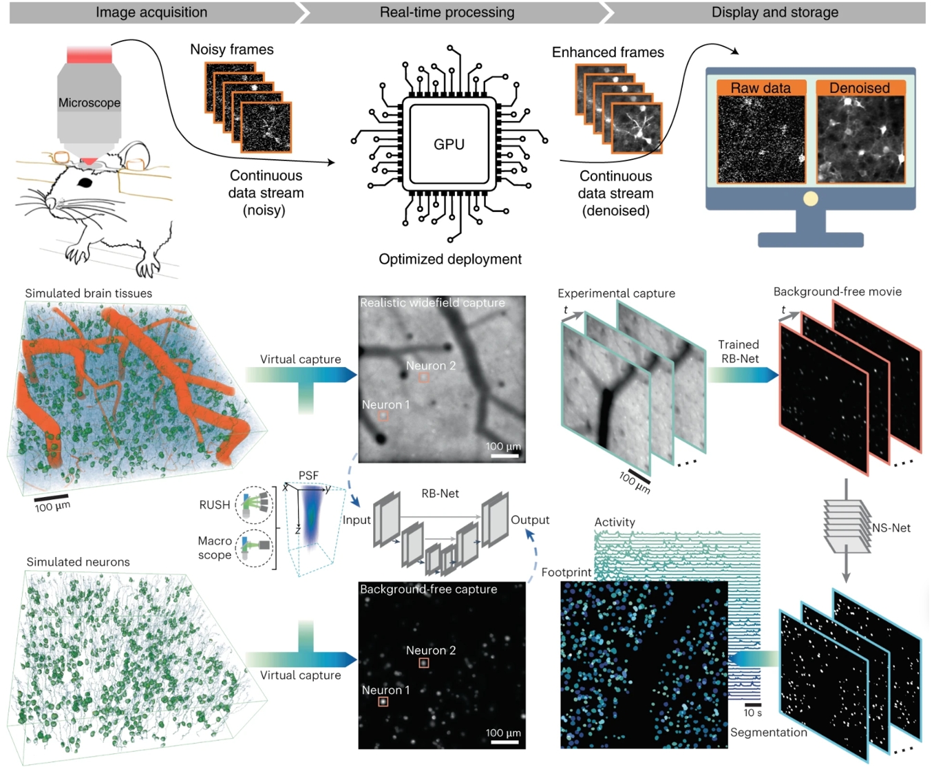 AI-powered image processing pipeline for denoising (top) and neural activity extraction (bottom). Credit: Tsinghua University