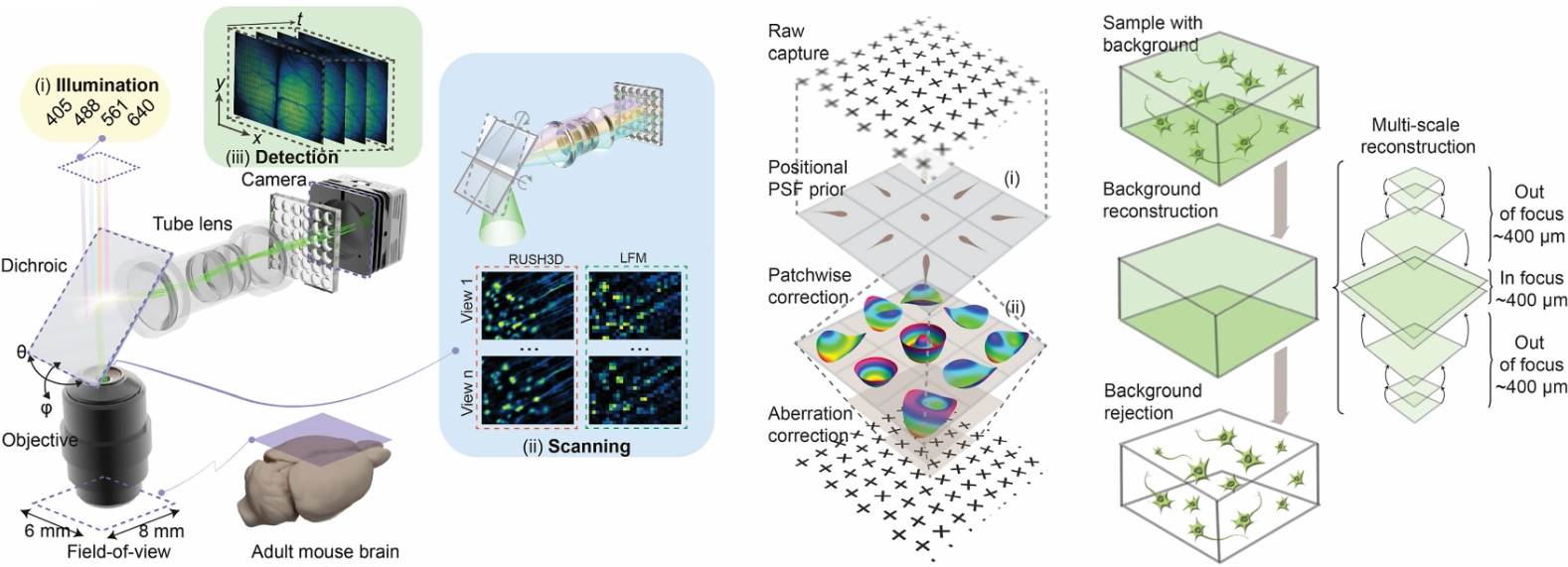The RUSH3D framework. An illustration of the system architecture (left) highlighting the wave-optics DAO (right) for large-scale aberration removal, enabling high-fidelity 3D imaging across mesoscale biological volumes. Credit: Tsinghua University
