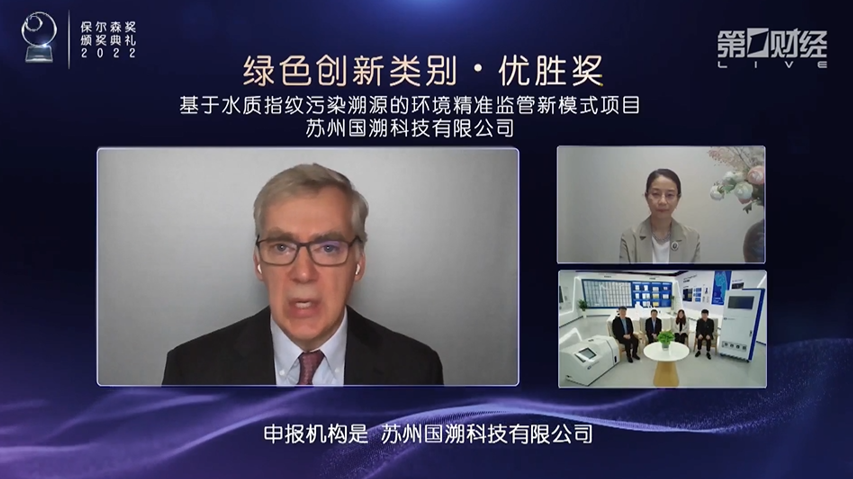 School of Environment, Tsinghua University, December 17, 2022 (Correspondent Cheng Cheng) On December 15, the award ceremony of the 2022 Paulson Prize for Sustainability (hereinafter referred to as the “Paulson Prize”), jointly organized by the Paulson Institute and Tsinghua University, was held online. The project “Innovative Pollution Monitoring Technology and Supervision Model Based on Aqueous Fingerprint” won the Best Award in the category of “Green Innovation”. The project is transformed from research results of the Research Center of Environmental Technology on Water Pollution Source Identification and Precise Supervision (hereinafter referred to as “WPSI-PS Research Center”) of Tsinghua University’s School of Environment, and declared by Suzhou G-Seeker Technology Co., Ltd (hereinafter referred to as “GSeeker®”), which was a specialized industrialization company incubated by Research Institute for Environmental Innovation (Suzhou) Tsinghua. It was awarded for its “transformative impact through innovative technologies and models, as well as intelligent and strategic data application and analysis”.