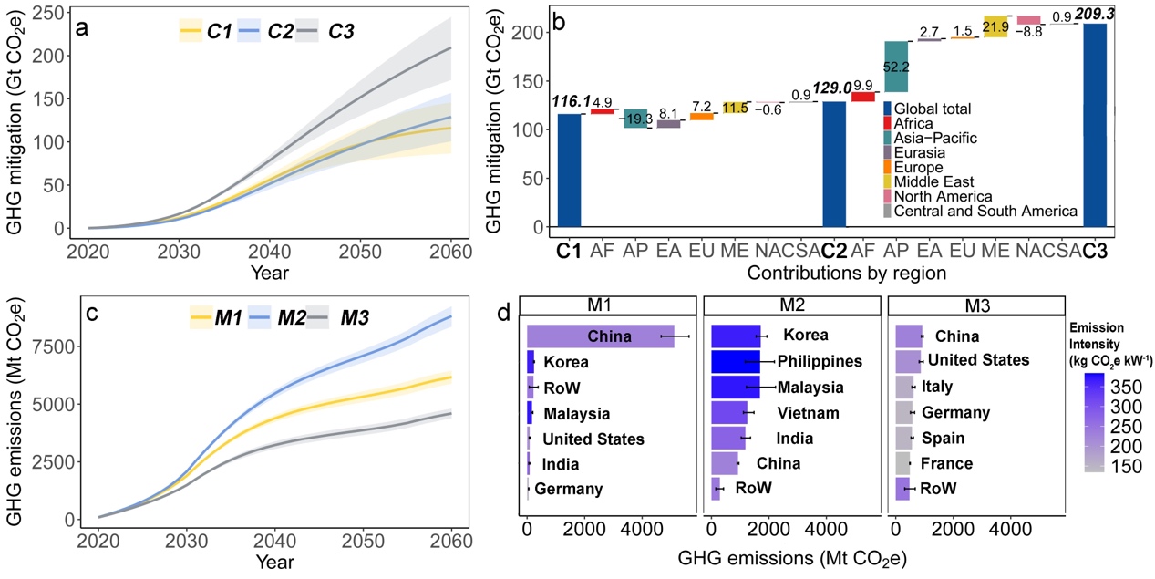 Against the backdrop of countries implementing trade protection and policies to enhance independent manufacture capacity, there is considerable uncertainty in the future global photovoltaic industry chain. The study assessed the net GHG mitigation of the global photovoltaic industry chain in the future by combining three types of manufacture and installation scenarios (Figure 2). The research indicates that the installation scenario has a more significant impact on the net GHG mitigation total. By 2060, if new installations lock in the current pattern (C1), the cumulative GHG mitigation will be between 86.5 billion and 145.8 billion tons. If new installations are balanced across nations (C2), the GHG mitigation will increase to between 100.7 billion and 156.6 billion tons. If the installation development sequence is further optimized to fully utilize the comparative advantages in GHG mitigation intensity among nations (C3), global GHG mitigation will further increase to between 171.7 billion and 244.7 billion tons. In this optimized scenario, the installation capacity in Africa, Eurasia, the Middle East, and Southeast Asia will significantly increase.