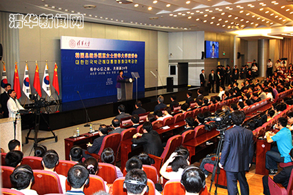 清华新闻网6月30日电(记者 高原)6月29日上午,韩国总统朴槿惠访问清华大学,并在主楼报告厅发表了题为“韩中心信之旅,共创新20年”的主题演讲。国务院副总理刘延东、教育部副部长郝平、驻韩大使张鑫森,韩国外交部长官尹炳世、韩国驻华大使权宁世,清华大学校长陈吉宁、校务委员会主任胡和平、副校长谢维和、副校长袁驷、校务委员会副主任史宗恺等出席演讲会。包括韩国留学生在内的清华大学师生代表500多人在现场听取了演讲。