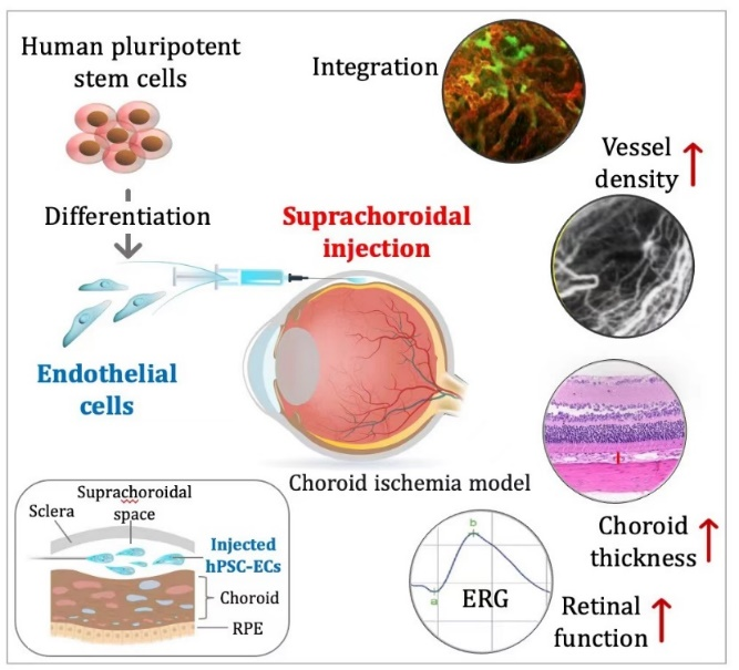 该研究将人多能干细胞高效诱导为类脉络膜血管内皮细胞,将其移植至脉络膜缺血动物模型脉络膜上腔,可有效改善脉络膜缺血,并提高视功能。
