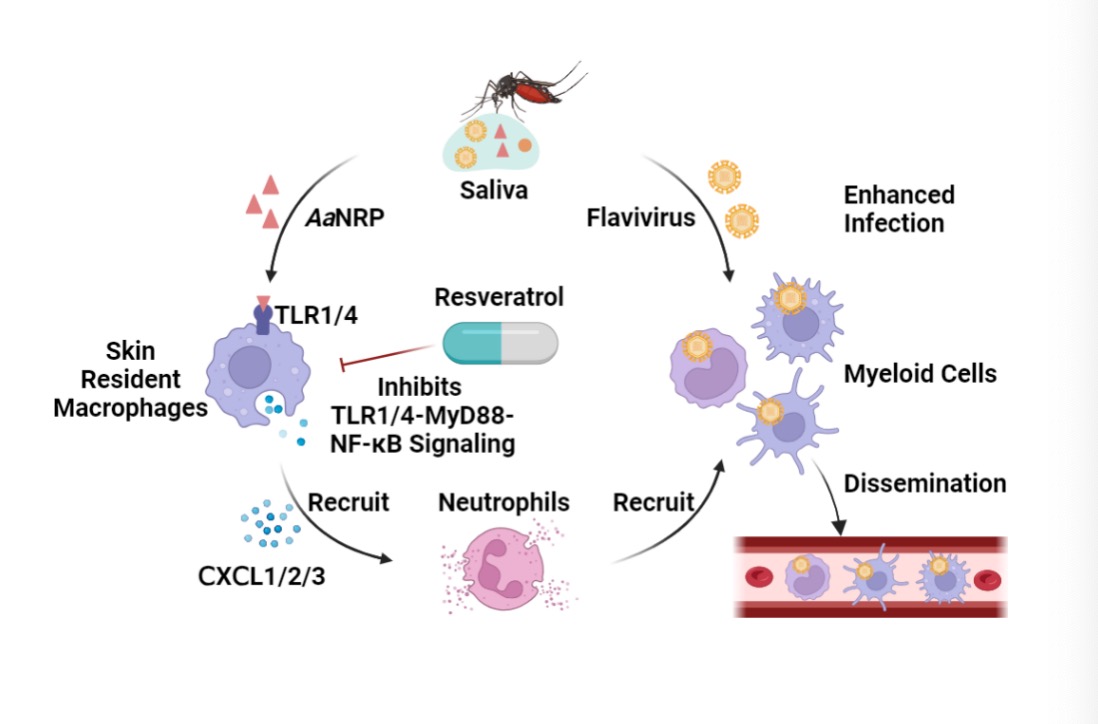 本研究揭示了蚊虫唾液中介导髓系细胞招募的关键唾液蛋白AaNRP及其作用机制,同时证明了AaNRP是辅助蚊媒病毒传播的重要唾液蛋白,为阻断蚊媒病毒的传播提供了新的干预策略和靶点。