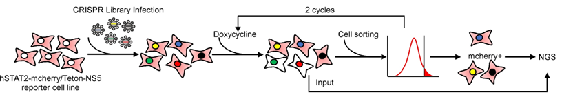 为了解决这一科学问题,研究团队利用HEK293T细胞,构建了ZIKV NS5介导STAT2降解的可视化报告细胞系。该细胞系可组成型表达STAT2-mCherry红色荧光融合蛋白,而ZIKV NS5的表达则受四环素诱导型表达系统Tet-On的调控。通过添加四环素类药物诱导NS5的表达后,可以利用流式细胞术或荧光显微镜观察到STAT2-mCherry的有效降解。利用该报告细胞系,结合CRISPR/Cas9全基因组筛选系统,作者筛选出一系列影响NS5介导STAT2降解的宿主基因(图1)。其中,ZSWIM8基因引起作者的重点关注,该基因是Cullin-RING泛素连接酶(CRL)复合体的底物识别蛋白,该复合体参与降解microRNA代谢途径的多个关键蛋白。