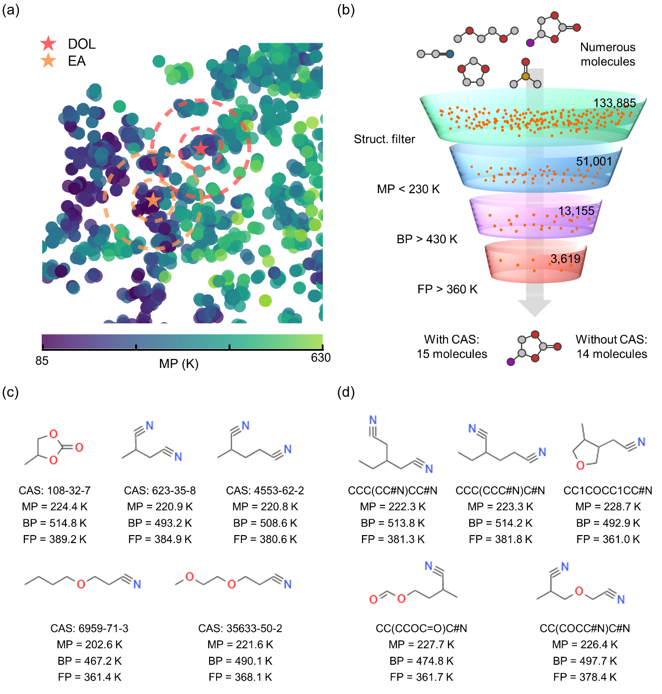 KPI框架首先收集并整理了大量电解液分子的结构和性质数据,自动整理成结构化数据集。通过可解释的机器学习算法,框架从微观角度探索了分子的构效关系,并将这些发现的知识嵌入到最终的预测模型中。KPI框架在熔点、沸点和闪点的预测中分别实现了10.4、4.6和4.8 K的低平均绝对误差(MAE)。此外,KPI在20个测试数据集中的18个达到了先进的预测结果。通过分子近邻搜索和高通量筛选,团队还成功预测了29个潜在适用于宽温域和高安全性的电池场景下的分子,其中一些分子已被文献证实具有优异性能,为电解液分子智能设计提供重要指导。