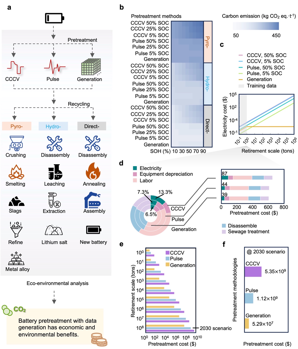 与传统的CCCV测试相比,基于生成模型的脉冲测试方法无需耗费大量时间调整SOC,也避免了对退役电池的额外损害。技术经济评估显示,在2030年全球动力电池退役场景下,该生成式机器学习辅助的SOH估计方法可节省约49亿美元电力成本,减少358亿公斤二氧化碳排放(图5)。这一方法在时间效率、能耗降低、环境效益和操作灵活性方面展现了显著优势。