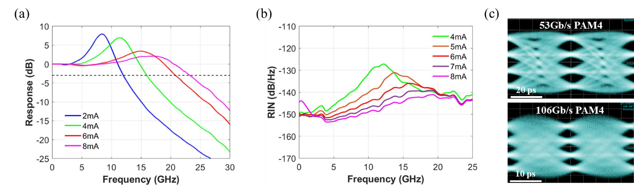 此外,团队对该VCSEL的频率响应、相对强度噪声(RIN)以及高速眼图进行了全面测试和分析(图4)。测试结果显示,该VCSEL在高频范围内保持优异的频率响应特性,能够稳定支持高速数据传输。特别是在最大工作电流(8 mA)条件下,VCSEL的RIN低至-144 dB/Hz,展现了卓越的低噪声性能和传输稳定性。在53Gbps和106Gbps PAM4高速传输测试中,眼图轮廓清晰,完全符合IEEE 802.3db™-2022标准,充分验证了其在高数据速率下的信号完整性和低噪声特性。这些测试结果表明,该设计在数据中心和超算系统短距离光互连中具有广泛应用的潜力。
