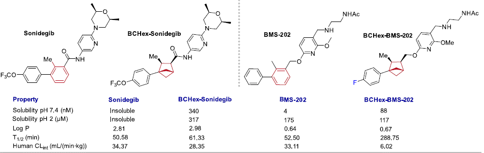 针对这一挑战,清华大学深圳国际研究生院生物医药与健康工程研究院林进顺团队与南方科技大学刘心元团队携手发展了路易斯酸催化双环[1.1.0]丁烷(BCB)分别与香豆素、2-吡喃或色酮等的不对称分子间[2π + 2σ]环加成反应,以优秀的对映/非对映/区域选择性合成了结构多样的、具有邻位的三级-四级碳手性中心的、1,2,3,4-四取代的BCHs。在该反应中,手性双噁唑啉配体的引入可以有效抑制副反应、能显著地减少外消旋的背景反应,并精确调控反应活性以及区域、对映和非对映选择性,所得的手性BCHs可以替代抗肿瘤药物Sonidegib和非肽类小分子PD-1/PD-L1抑制剂BMS-202中的苯环,并合成了这两个生物活性分子的手性类似物BCHex-Sonidegib和BCHex-BMS-202(图2)。