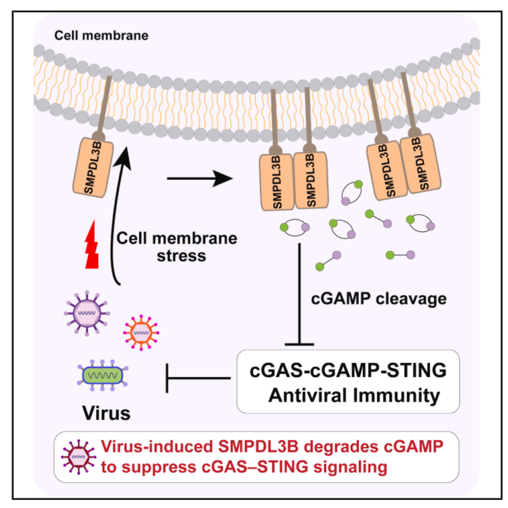 研究成果以“病毒感染介导细胞膜完整性改变,激活SMPDL3B通过降解cGAMP负调控cGAS-STING免疫信号”(Membrane integrity changes upon viral infection activate sphingomyelinase SMPDL3B to restrict cGAS-STING signaling via cGAMP degradation)为题,于10月31日发表于《免疫》(Immunity)。
