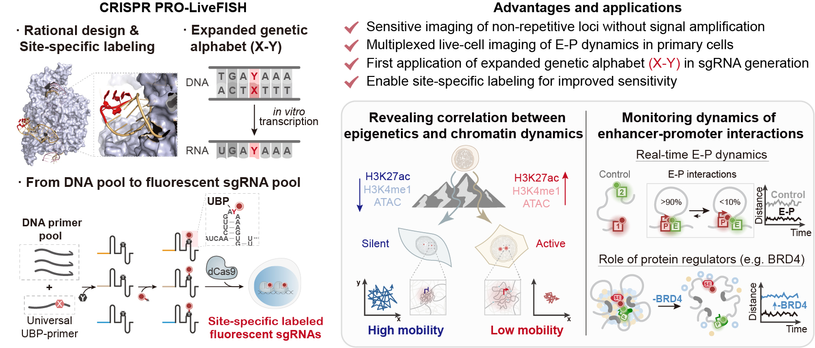 清华新闻网11月7日电 三维基因组结构与表观遗传修饰是调控基因表达的重要机制,其动态变化与发育、细胞命运决定及癌症等疾病的发生密切相关。测序技术与固定细胞荧光原位杂交(Fluorescencein situ hybridization, FISH)等方法极大推动了三维基因组互作的研究,但这些方法多依赖固定样本,难以反映染色质在活细胞中的实时动态变化。实现基因组在活细胞内的时空可视化是理解基因调控动态的关键。现有基于CRISPR-Cas系统的活细胞成像技术虽能靶向内源基因序列,但在非重复序列标记、多位点同时成像及原代细胞应用方面仍存在灵敏度不足、系统复杂度高等难点。