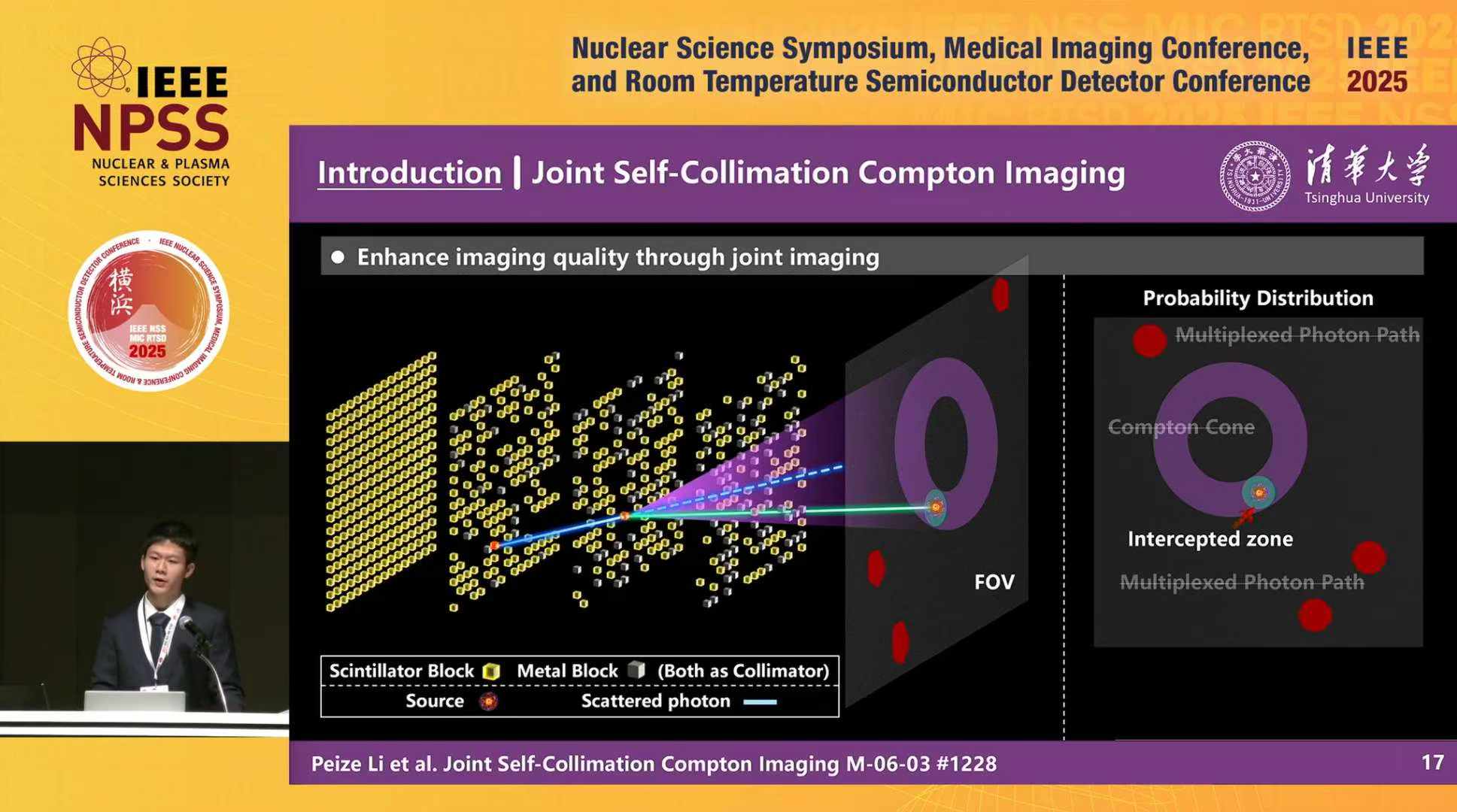 清华新闻网11月19日电 近日,国际电子与电气工程师协会核科学与医学影像2025年会(IEEE Nuclear Science Symposium and Medical Imaging Conference 2025, IEEENSS/MIC 2025)在日本横滨举行。经评审委员会(judging panel)投票,清华大学工程物理系2023级博士生李沛泽作为第一作者的论文获得最佳口头论文奖第一名,论文题目为“自准直-康普顿联合成像:一种高分辨率、高信噪比的高能SPECT解决方案”。