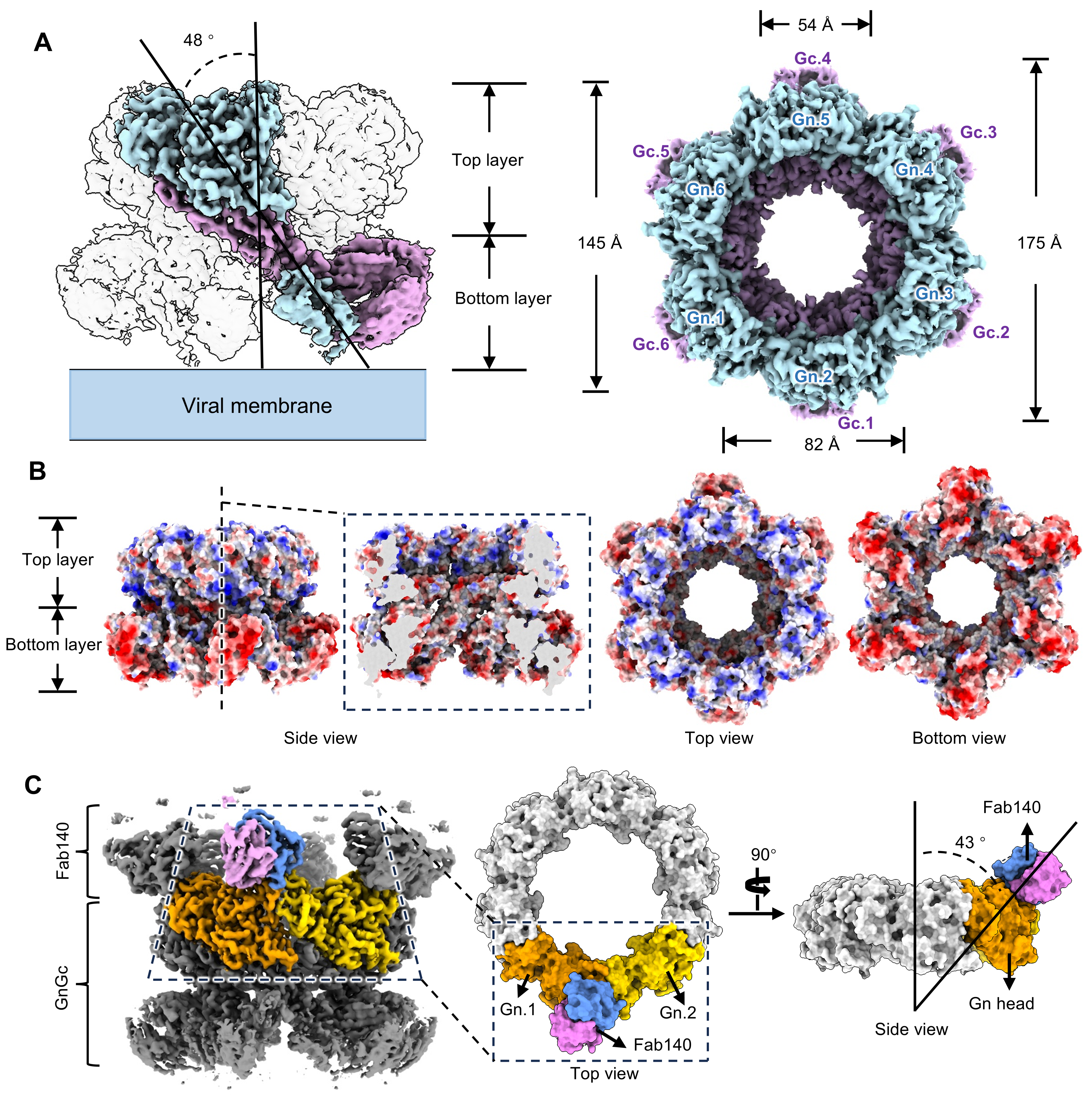 研究团队通过共表达GnGc与一种识别结构表位的中和性抗体RVFV-140的Fab区(Fab140),成功获得了可形成稳定GnGc六元环结构的复合物,并利用冷冻电镜技术解析了其近原子分辨率结构。RVFV GnGc-Fab140复合物由六个GnGc异二聚体和六个Fab140组成。其中GnGc异二聚体结构与此前报道的Gn、Gc单体结构具有显著差异。六个GnGc异二聚体以倾斜方式围绕中心轴分布,形成一个由上下两层组成且每层直径不同的六元环状结构。其中,上层主要由Gn的头部(结构域A、B和β片层区)构成,下层则由Gn的结构域C及Gc的结构域I和III共同组成。每个Fab140结合在六元环上层两个相邻Gn头部之间,对稳定GnGc六元环结构起到了关键作用。GnGc六元环结构形成的过程中,四个位于Gn分子间作用界面的loop区发生剧烈构象改变。