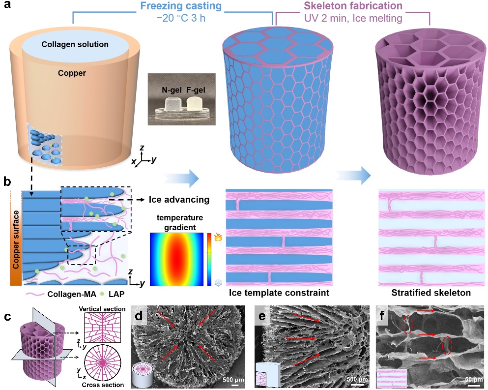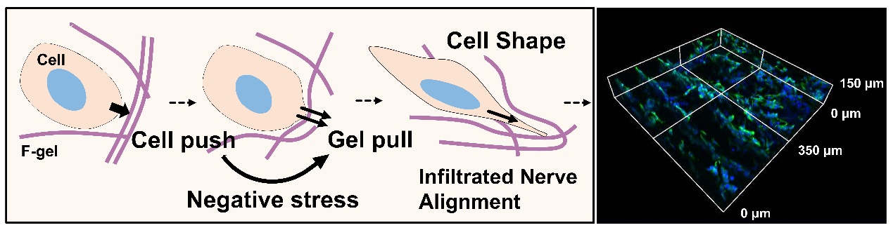 针对这一难题,清华大学深圳国际研究生院耿洪亚助理教授团队基于在低温生物工程和控冰技术方面的积累,开发了一种具有仿生天然细胞外基质的“负应力”效应的胶原蛋白水凝胶(F-gel),该材料能在外力压缩时,沿加载方向产生主动的牵引力(负应力),而非传统材料被动的抗压阻力(正应力),从而成功模拟天然ECM的牵引力信号,显著促进了神经细胞定向排列与深度浸润(图1)。