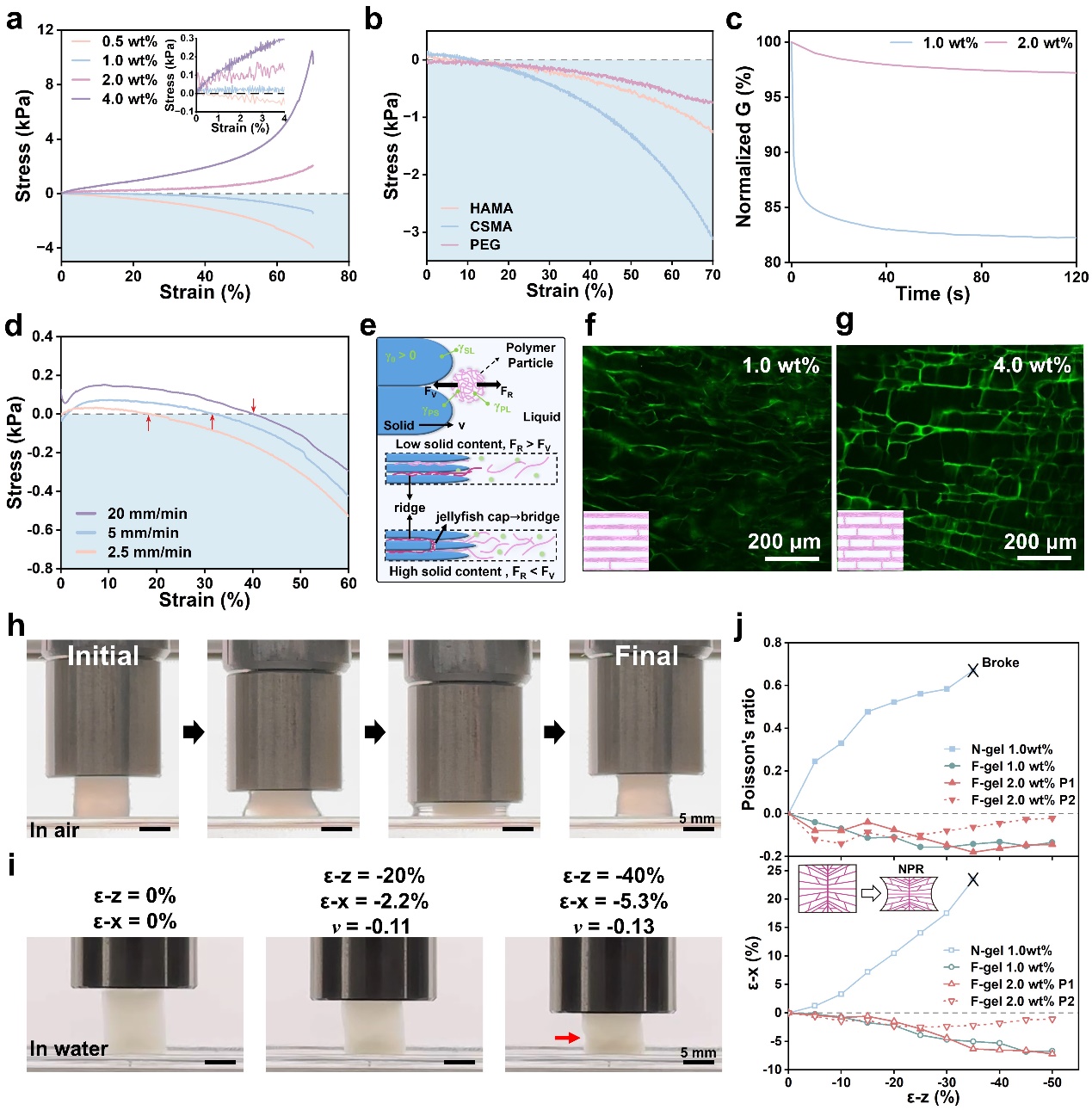 研究团队采用正交温度梯度下的定向冷冻策略,使胶原蛋白在冰晶生长过程中发生富集与重排,形成由层状通道和层间桥接构成的各向异性骨架(图2)。与常规均质水凝胶不同,F-gel在受压时并非产生力学抵抗,而是表现出沿加载方向的反常收缩行为,即负应力响应。实验结果表明,低固含量的F-gel负应力最大值可达−27.77kPa,随着固含量升高,可以转变为常规正应力。这种力学行为的“开关”转换,源于材料内部独特的层间桥结构以及水合状态的动态变化,从而实现对力学信号方向与幅值的可编程调节(图3)。