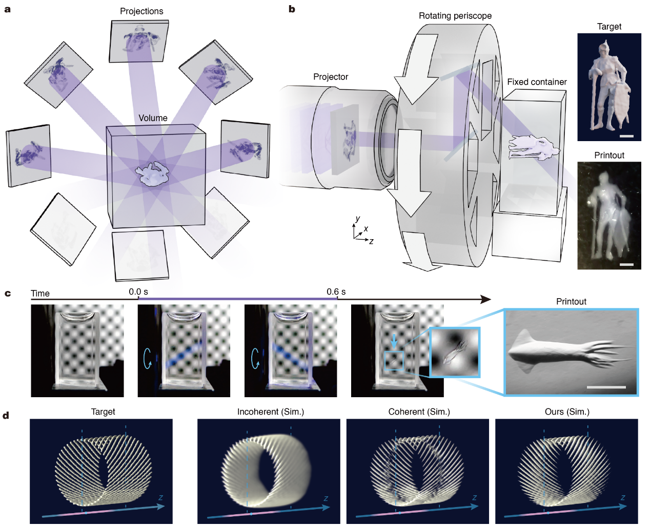 清华新闻网2月12日电 三维打印技术作为科学研究和工业生产的重要工具,其高效率、高精度的性能突破关系到生物医学、微纳科技等多个前沿领域的发展。现有的三维打印技术存在较为突出的“速度和精度”的矛盾:传统逐点、逐层打印技术虽能保障精度,但打印效率较低,毫米级物体往往需要数十分钟甚至数小时才能完成加工,难以适配实际科研与生产的需求;现有的体积打印技术,如计算轴向光刻(CAL),采用一体成型的打印方式提升了速度,却受限于容器需旋转和景深不足等因素,样本在景深外的打印精度显著下降,且只能使用高粘度材料防止样品下沉,适用范围受到较大限制。