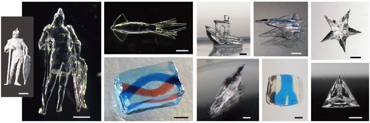 借助创新的光学系统设计,DISH系统突破了逐点或逐层扫描模式的速度瓶颈,可在极短时间内精准投影出复杂的三维光强分布。实验表明,该技术生成毫米尺寸复杂结构的曝光时间仅需0.6秒,体积打印速率达333 mm³/s,相当于每秒生成1.25×10⁸个体素。这创造了体积三维打印曝光时间的新纪录,远超传统体积打印技术的30秒水平,更是传统逐点、逐层打印技术几分钟到数小时的加工耗时所无法企及的。