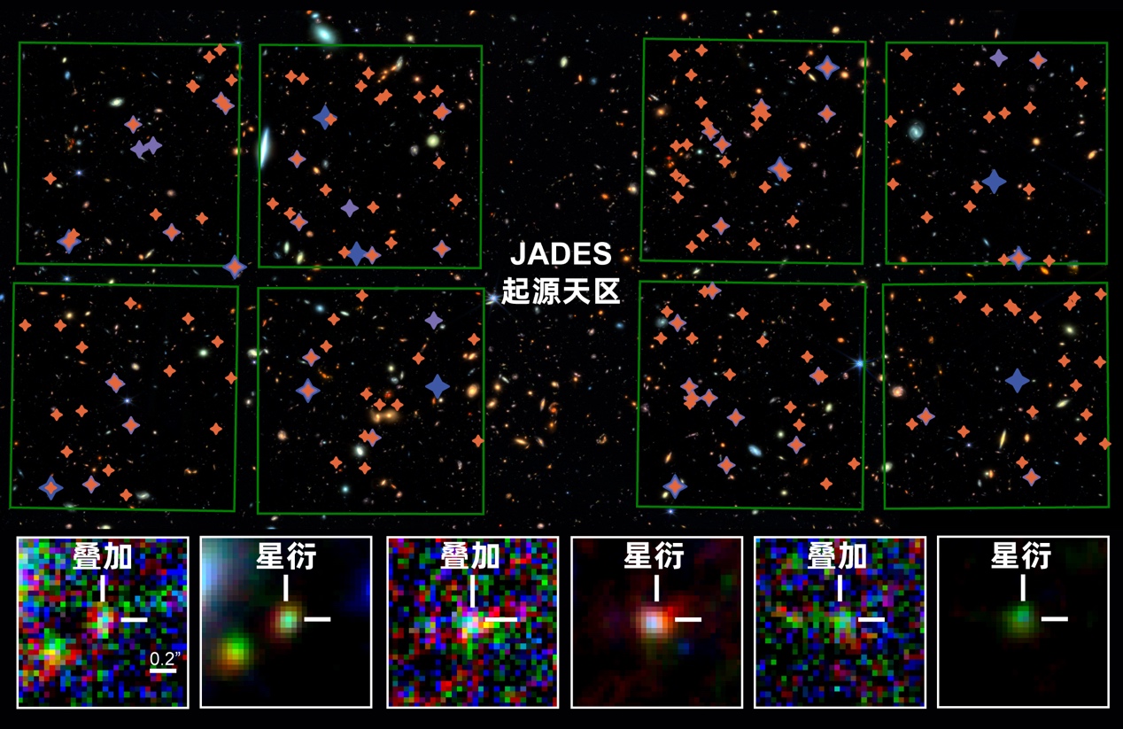 过往研究(蓝紫星标52个)与星衍(橙色星标162个)发现的高红移候选星系效果对比
