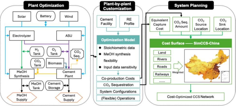 研究团队提出“水泥甲醇联产”协同路径,利用可再生电力电解制氢副产的高纯氧支撑水泥窑富氧燃烧与二氧化碳捕集,并将捕集到的二氧化碳作为甲醇合成碳源,实现跨流程物质耦合。研究基于小时级、考虑运行灵活性的过程模型优化联产系统配置,并在全国尺度评估逐厂部署与二氧化碳源汇匹配策略。研究发现,相较于分别推进水泥脱碳与可再生甲醇路径,“水泥甲醇联产”可显著降低总体减排成本,更适合优先在可再生资源条件较好的水泥厂布局;同时,该技术的引入可能对二氧化碳运输与封存等基础设施的空间规划产生重要影响。
