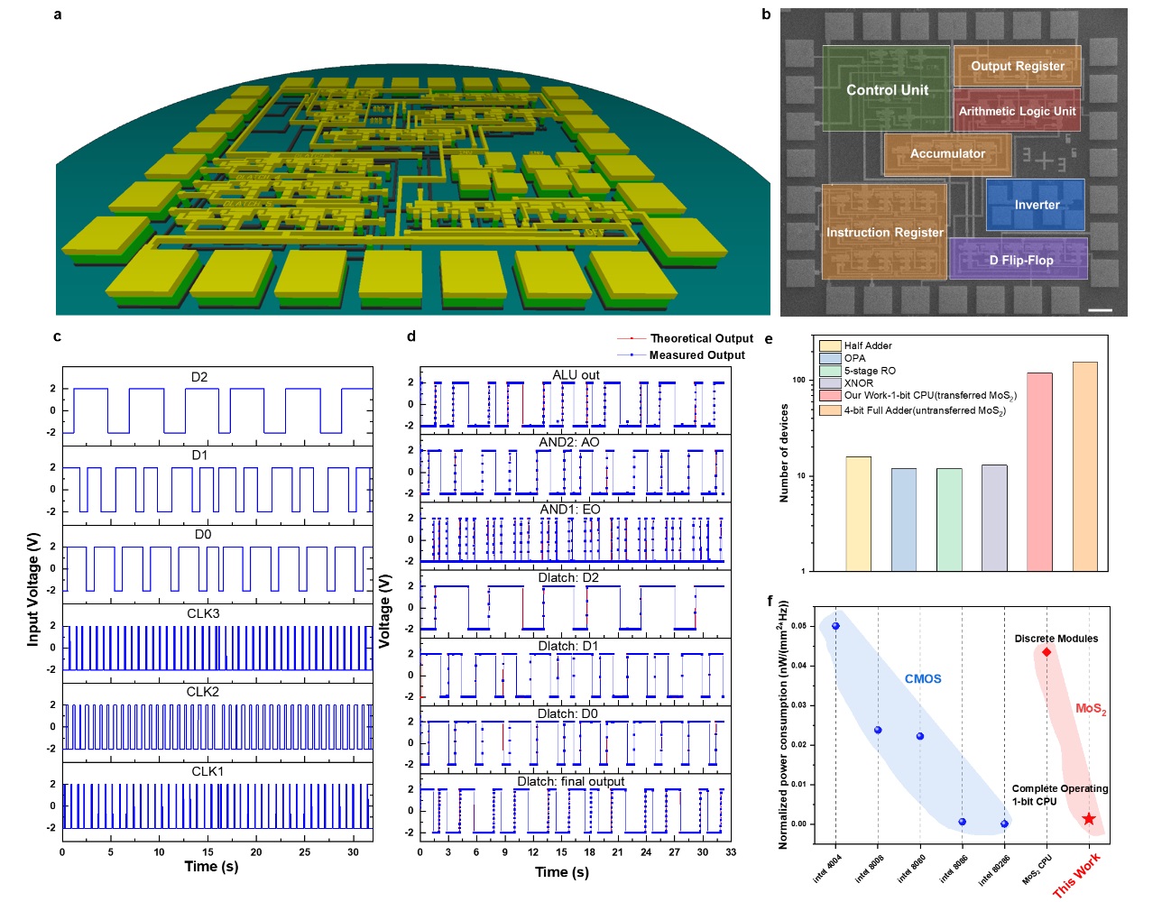 图4.基于二硫化钼(MoS2)的全连接的中央处理器(CPU)及其与不同材料、规模的电路的对比