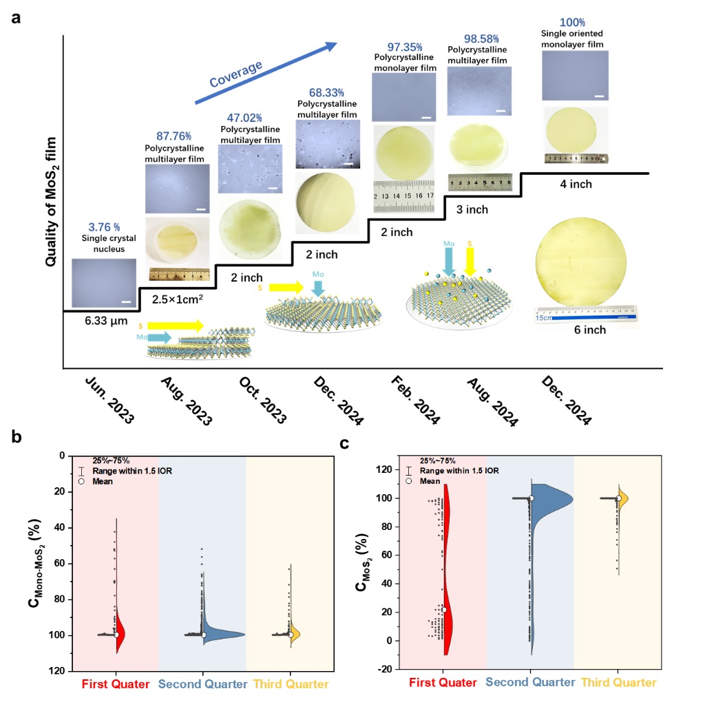 图2. 晶圆级单层二硫化钼(MoS2)生长优化及其表征