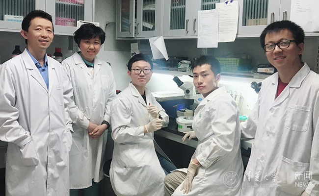 部分研究人员合影,从左至右分别为:清华大学生命学院颉伟研究员、医学院那洁研究员、生命学院博士生刘伯峰、医学院博士生王培哲、医学院博士生段福宇