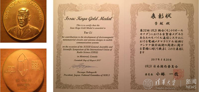 清华新闻网8月24日电 清华大学电子工程系青年教师李越获得国际无线电科学联盟(International Union of Radio Science,URSI)古贺逸策金牌(Issca Koga Gold Medal),以奖励其在电磁超材料电路及移动通信天线领域的贡献(Citation: "For contributions to the development of electromagnetic metamaterial circuits and antenna designs in mobile communication systems.")。8月20日,在加拿大蒙特利尔举行的第32届国际无线电科学大会(2017 URSI GASS)开幕式上,李越被授予该奖。