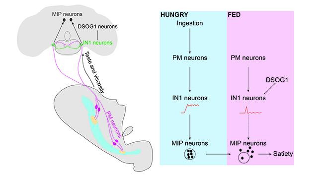 清华大学生命学院、清华IDG/麦戈文脑科学研究院张伟研究员课题组研究了咽喉中机械力感受调节果蝇进食的机制。果蝇的咽喉有丰富的感觉神经元。其中,共表达机械力受体nompC和味觉受体Gr43a的神经元可以被食物带来的刺激激活,并将信号传递至大脑中的中间神经元IN1。IN1神经元作为整合饥饿状态和食物信号的中枢,在饥饿的果蝇中接收到咽喉处的信号后,可以激活神经肽MIP的释放。MIP的释放累计促进果蝇的饱腹感形成。nompC突变果蝇与野生型果蝇相比进食量显著上升,MIP突变果蝇也出现相似的表型,而激活IN1神经元或MIP神经元可以降低果蝇进食量。这些结果表明,位于大脑中的神经环路可以整合进食过程中产生的机械力刺激和动物自身的营养状态,协同调控进食行为。