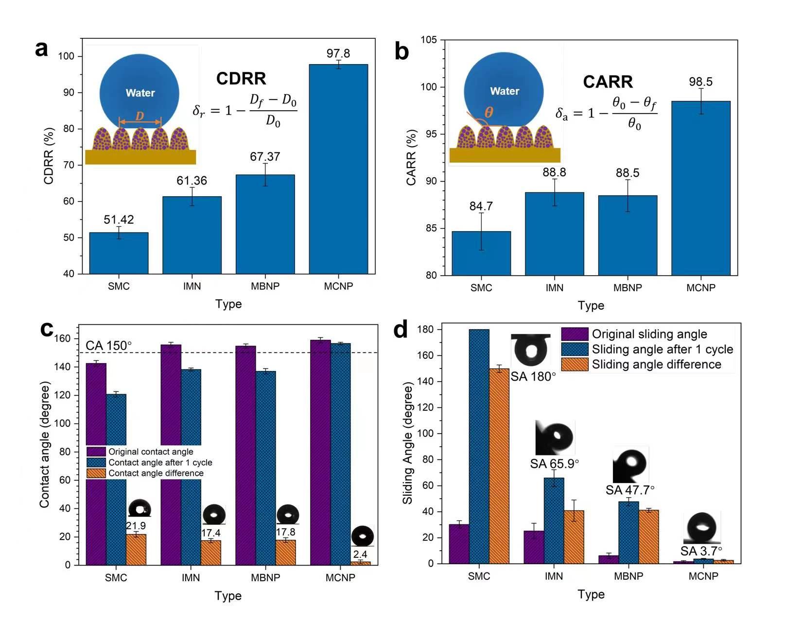 图3 四种表面在结冰与融冰循环前后液滴状态变化的表征:(a)接触直径变化率;(b)接触角变化率;(c)循环前后接触角变化;(d)循环前后滚动角变化
