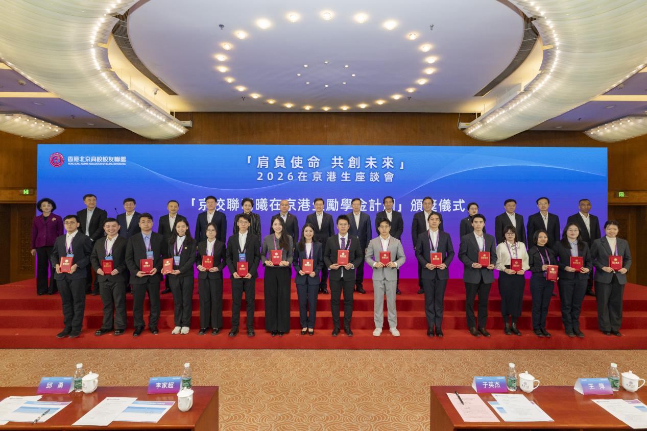 李家超、于英杰、邱勇等共同为“京校联明曦在京港生励学金计划”获得者颁发证书。