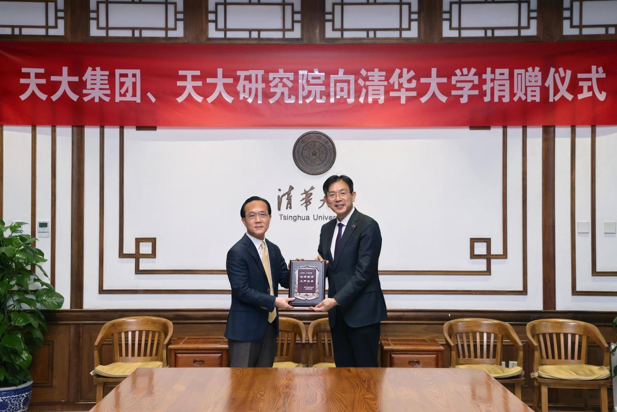 天大集团、天大研究院董事高茵与清华大学教育基金会秘书长袁桅签署捐赠协议。李路明向方文权颁发捐赠纪念牌。