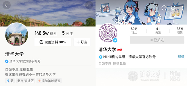 2018年至今,清华大学先后注册了抖音、B站、快手三大短视频平台官方账号,目前,三平台账号粉丝数均位居全国高校榜首。同时,也推动学校二级单位同步开通账号,着力打造多层级、多类型的校园短视频矩阵。现已初步形成“清华招生”“清华就业”“清华大学研究生会”“清华研读间”等多个短视频平台账号与官方账号同频共振、互相促进的运行生态,积极助力学校大宣传格局的不断完善和提升。