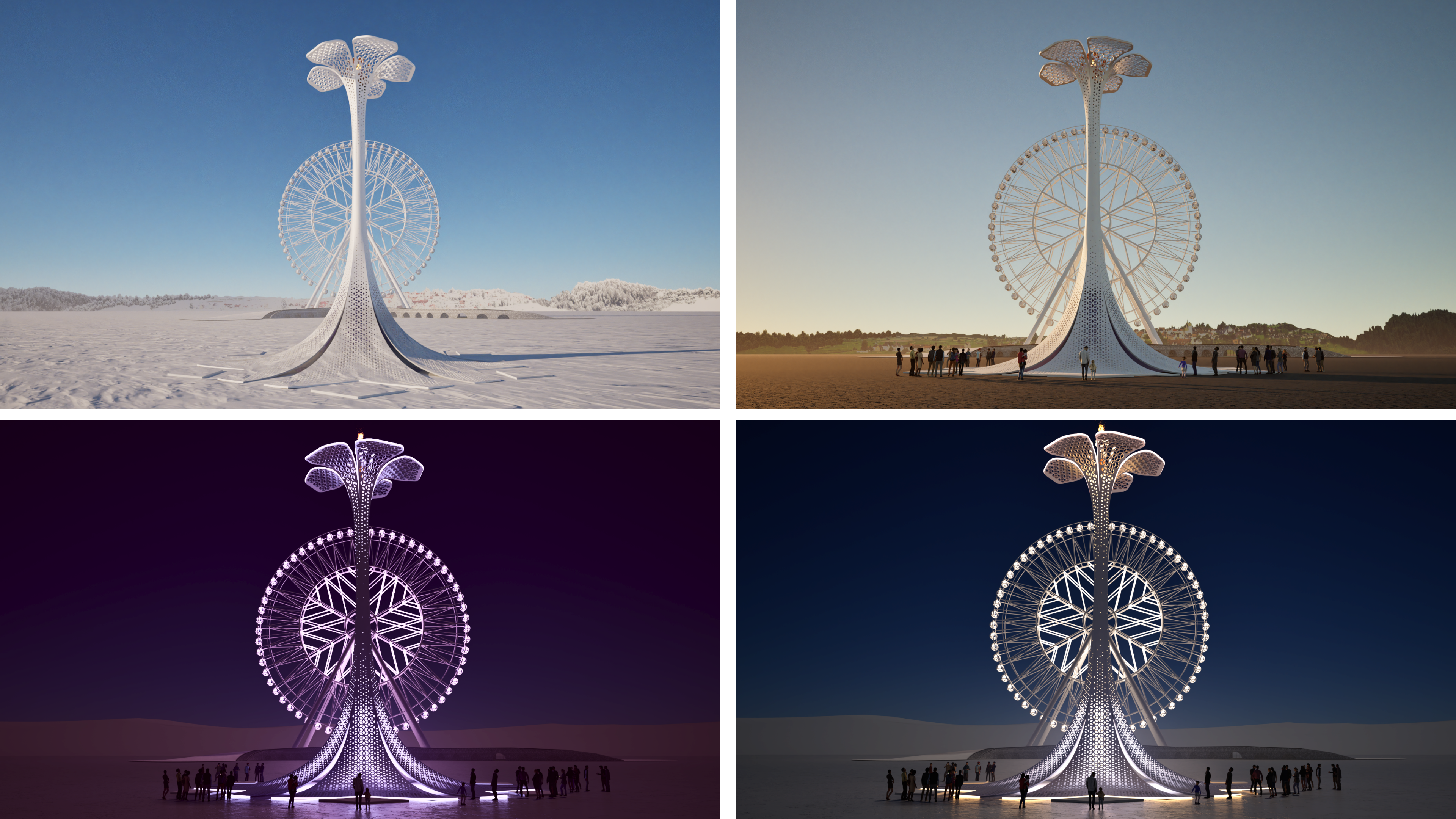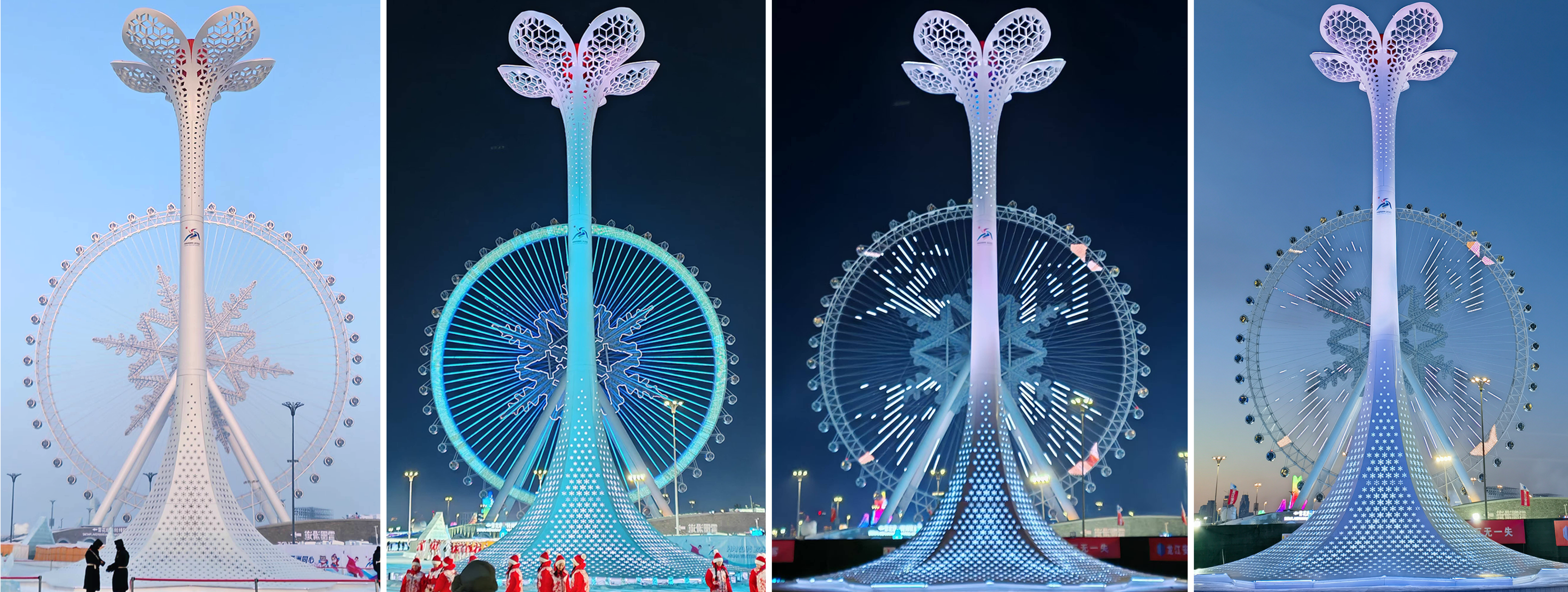 火炬塔底部设有宽阔平台,内部灯光系统由7080颗LED点光源组成,顶部花瓣配有总长120米的软灯带勾勒出丁香轮廓,同时在火炬塔周身配有大投光灯、小投光灯,以高效节能的照明技术降低能源消耗,同时营造出晶莹剔透的光影效果,宛如在冰雪世界中托起一朵傲然绽放的五瓣丁香。火炬塔在一天中的不同时刻展现出不同的风姿:晨曦中,纯白的塔身熠熠生辉;日光下,整体造型端庄挺拔;夜幕降临后,灯光穿透精致的雕纹,与火炬塔表面的丁香花、雪花纹样交织盛开,绽放出璀璨光华。绚丽的光影与哈尔滨冰雪大世界的景观交相辉映,共同编织出一幅动人的冰雪画卷,为这座北国冰城注入浪漫与活力。