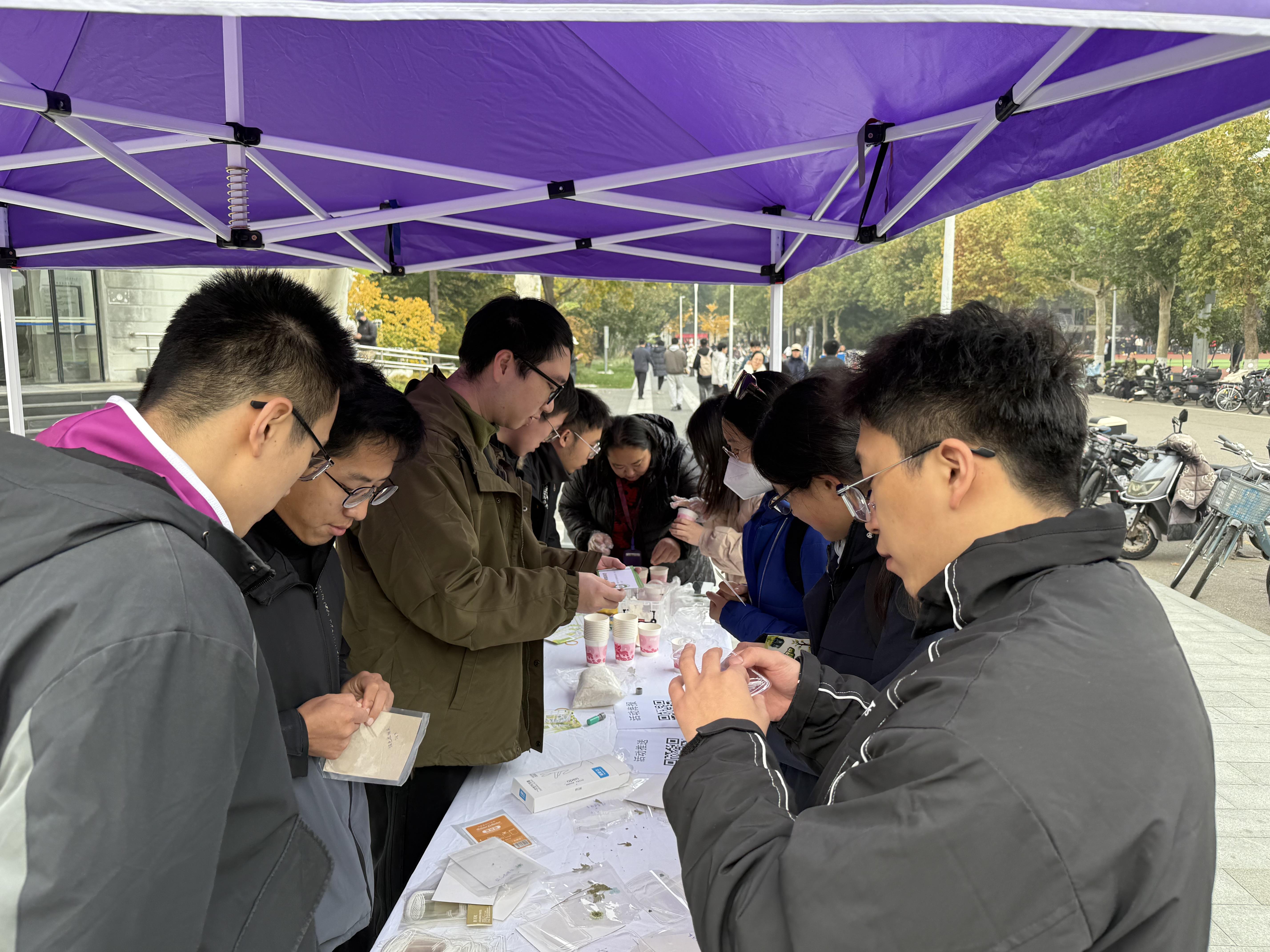 11月6日中午,学生服务中心(C楼)前广场的核心活动区迎来参与高峰。低碳手工体验区的“压花书签制作”和“种子球制作”项目吸引了众多同学驻足,同学们围在一起,在志愿者的指导下挑选花材、固定封装,亲手制作独一无二的干燥花书签;或用纸浆包裹花种,搓揉成可抛撒的种子球,为寝室绿植培养储备“绿色希望”。