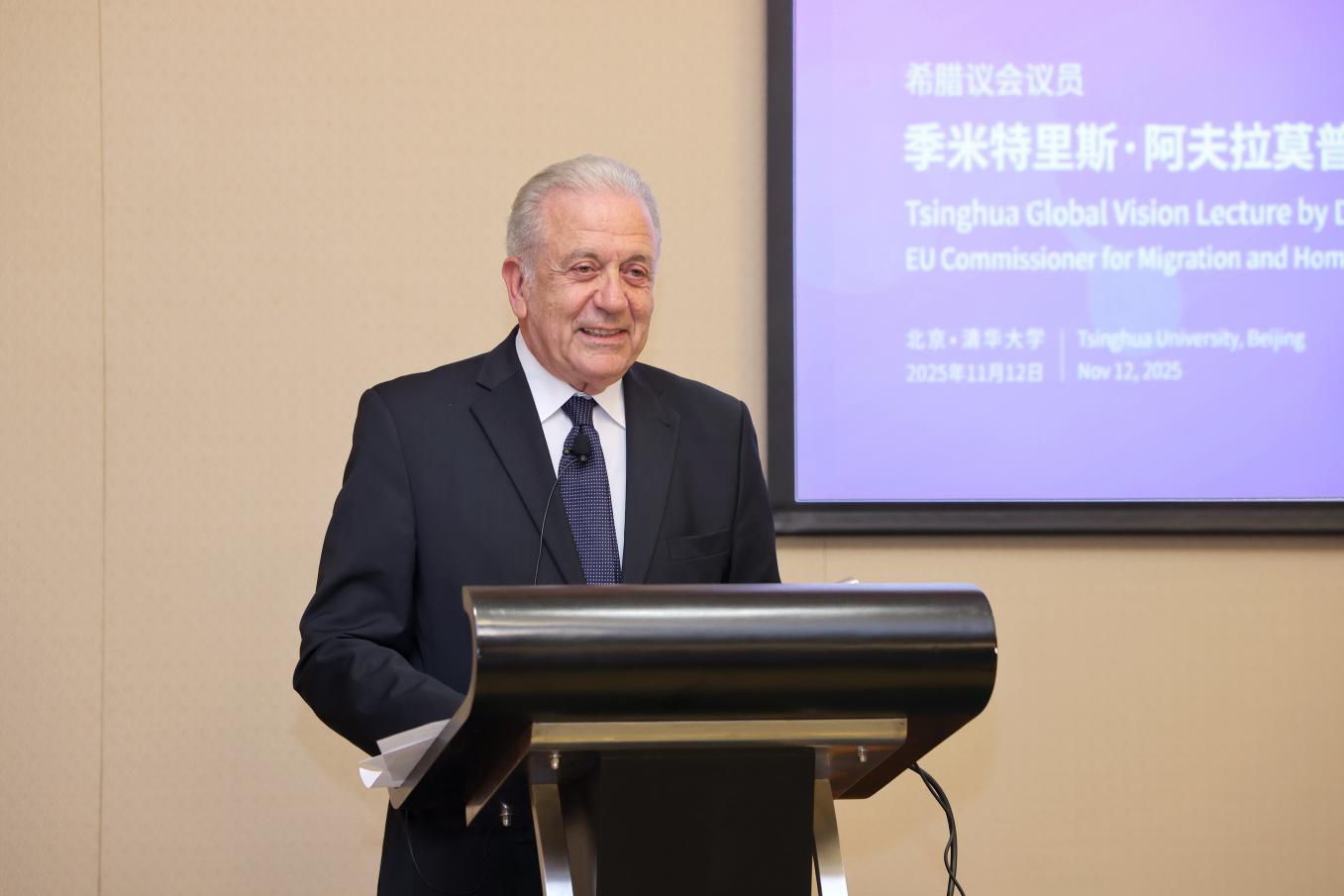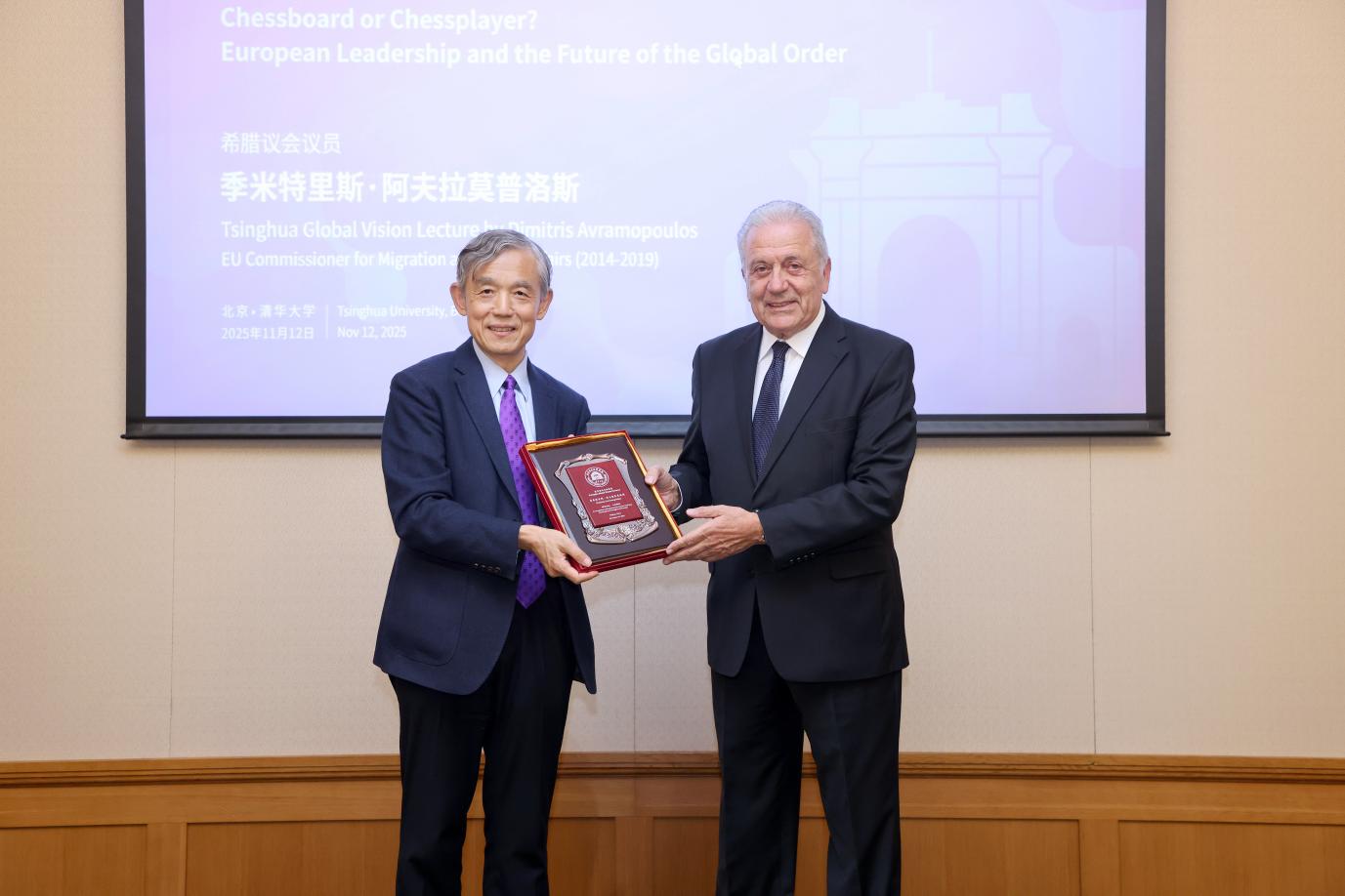 清华新闻网11月19日电 11月15日,希腊议会议员,前欧盟委员会主管移民、内部事务与公民事务的委员季米特里斯·阿夫拉莫普洛斯(Dimitris Avramopoulos)做客清华大学海外名师讲堂第262讲,以“棋局还是棋手?欧洲领导力与全球秩序的未来”为题发表演讲。苏世民书院院长薛澜出席活动并为季米特里斯·阿夫拉莫普洛斯赠送纪念牌。