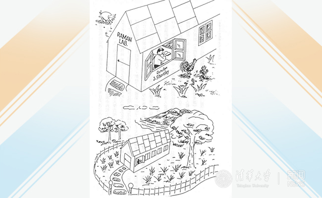 良好学校环境的第二个要素是优良学风。1991年,美国密歇根大学授予吴大猷先生荣誉科学博士学位,密歇根大学物理系和杨振宁、李政道等人在学位授予仪式前一天,安排了一个“吴大猷研讨会”(The Ta-You Wu Symposium)。黄昆接受邀请作了一个学术报告。在报告最后,他展示了一张画(图3),重现了他跟随吴大猷先生念研究生时的情景。当时为了躲避日军对昆明的狂轰滥炸,联大大部分教师分散住在昆明市郊,吴大猷和夫人在离昆明市5公里的岗头村租了一处农舍,共有五间小平房,茅草顶、泥巴地。图的上方是这五间茅屋的的局部放大图,图左上角还有一头猪。黄昆在西南联大帮吴大猷养猪,是当时流传很广的一个故事。