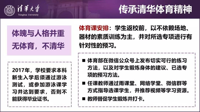 邱勇校长在课上还专门讲到了清华优良的体育传统,号召同学们返校前在家坚持锻炼,发扬“无体育,不清华”的精神,坚持“育人至上,体魄与人格并重”的体育教育观,不愧是“五道口体校”的校长。