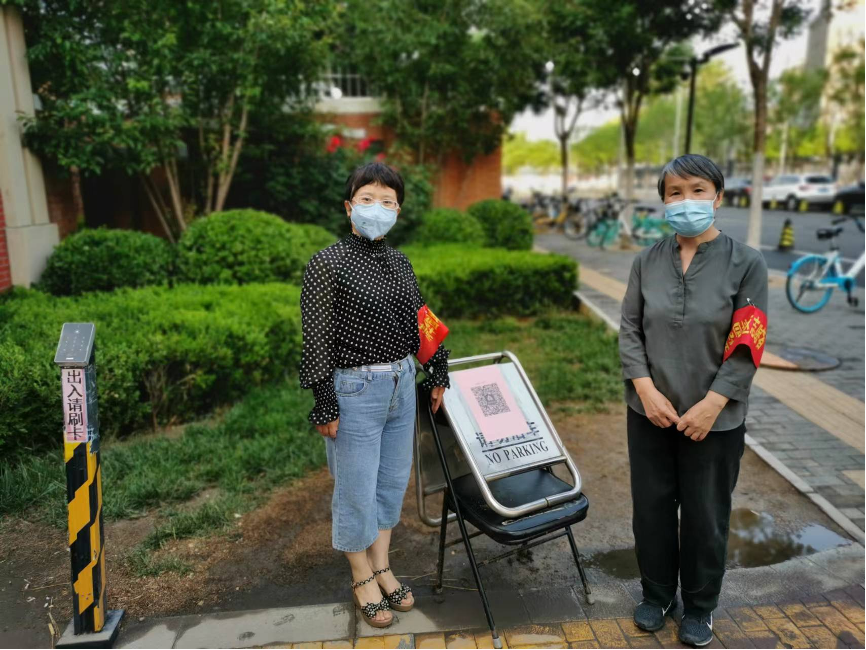 “双报到”党员柏淑娟参与门卫扫码值守(右一)