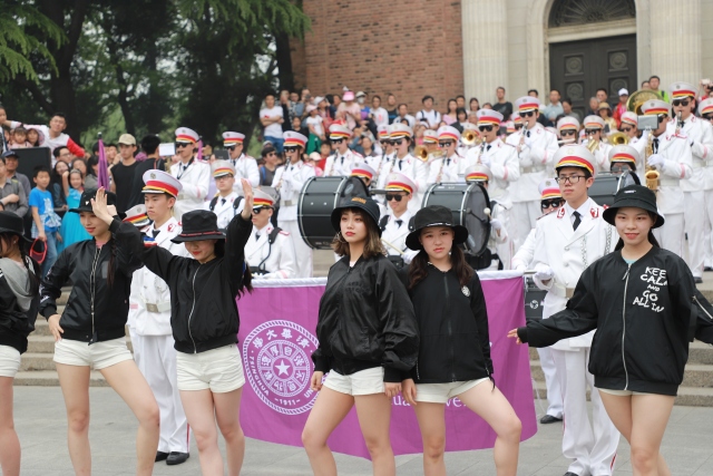 今年的校庆游园活动由学生艺术团军乐队、国标队,学生体育代表队啦啦操队以及各院系代表吉祥物联袂呈现。