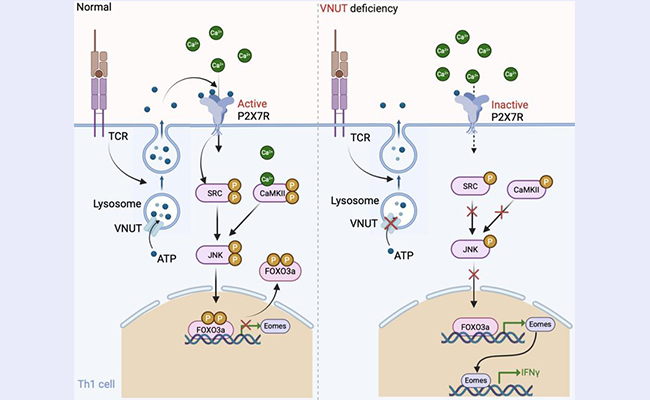 近日,清华大学药学院陈立功课题组及其合作者报道了ATP转运蛋白VNUT通过调控P2X7R-JNK-FOXO3a-Eomes信号通路对Th1细胞的分化产生了调控作用。