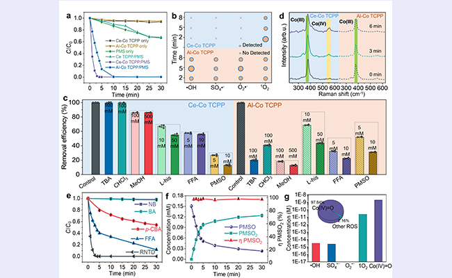 近日,清华大学深圳国际研究生院张正华副教授团队将膜过滤与纳米限域催化深度耦合,基于金属四(4-羧基苯基)卟啉框架(H₂TCPP)构建了层状限域催化膜(Ce-Co TCPP),通过远程电子调控突破“氧壁效应”,实现Co(IV)=O主导的非自由基高效氧化路径,在可持...