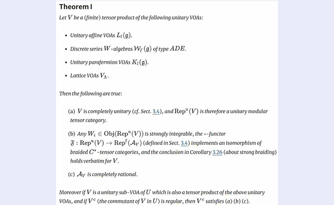 1月23日,清华大学丘成桐数学科学中心的助理教授归斌在《数学新进展》(Inventiones Mathematicae)上在线发表了文章“共形网的范畴扩张中的无界场算子”。在这篇文章中,归斌创新地对共形网的表示的融合积(fusion product of representations of conform...