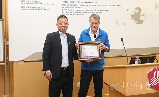 清华大学五道口金融学院副院长周皓为拉尔斯·汉森教授颁发纪念证书。